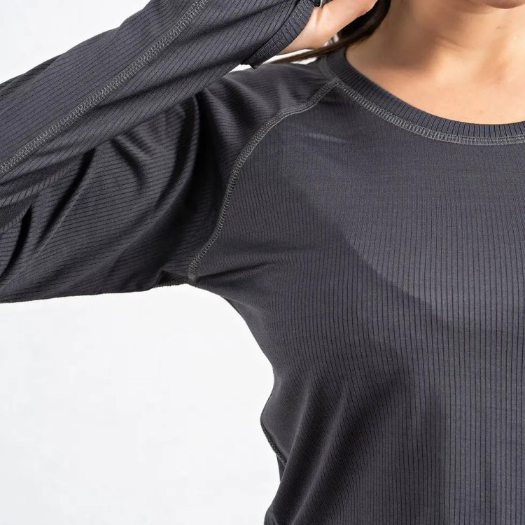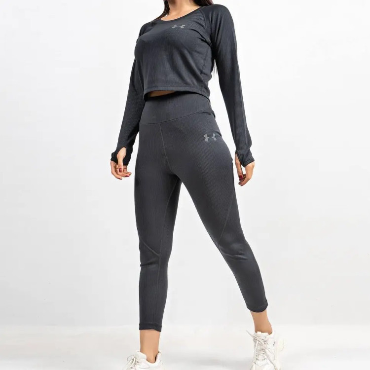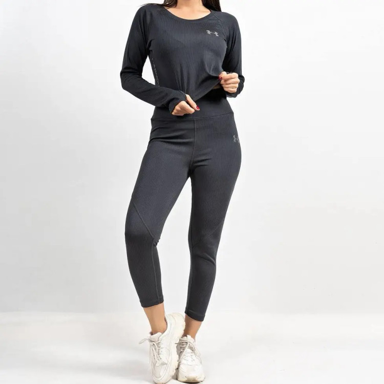 ست نیم تنه آستین دار یا کراپ و لگ ورزشی پارچه کبریتی سایز بندی:M.L.XL تک رنگ مشکی فینگردار
